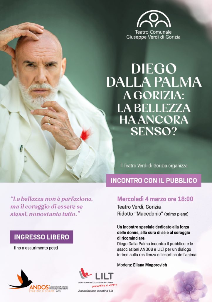 La bellezza ha ancora senso? Questo l’interrogativo al centro dell’incontro tra Diego Dalla Palma e il pubblico, che si terrà mercoledì 4 marzo alle 18:00 al Ridotto “Macedonio”, un pomeriggio dedicato alla forza delle donne e alla cura di sé, in collaborazione con ANDOS comitato di Gorizia e Associazione Isontina LILT e aperto a tutti, con ingresso libero fino ad esaurimento posti.
